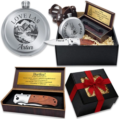 Prezent na Święta Zestaw Nóż Myśliwski + Piersiówka Okrągła z Grawerem
