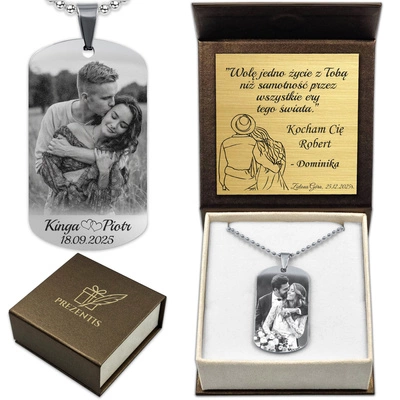 Nieśmiertelnik z GRAWEREM Zdjęcia Męski Stalowy Srebrny Pudełko Premium