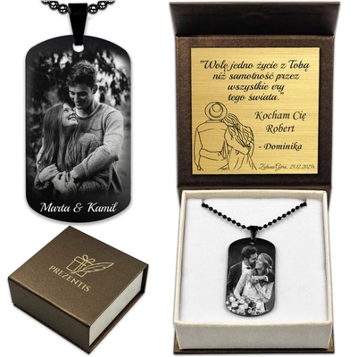 Nieśmiertelnik z GRAWEREM Zdjęcia Męski Stalowy Czarny Pudełko Premium