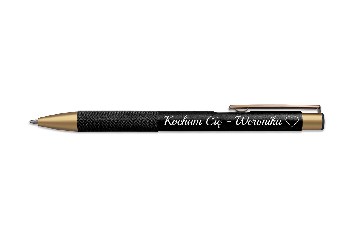 - Elegancki czarny długopis z metalowym korpusem i złotymi elementami. Doskonały do codziennego użytku lub na prezent. Personalizowany grawer GRATIS.