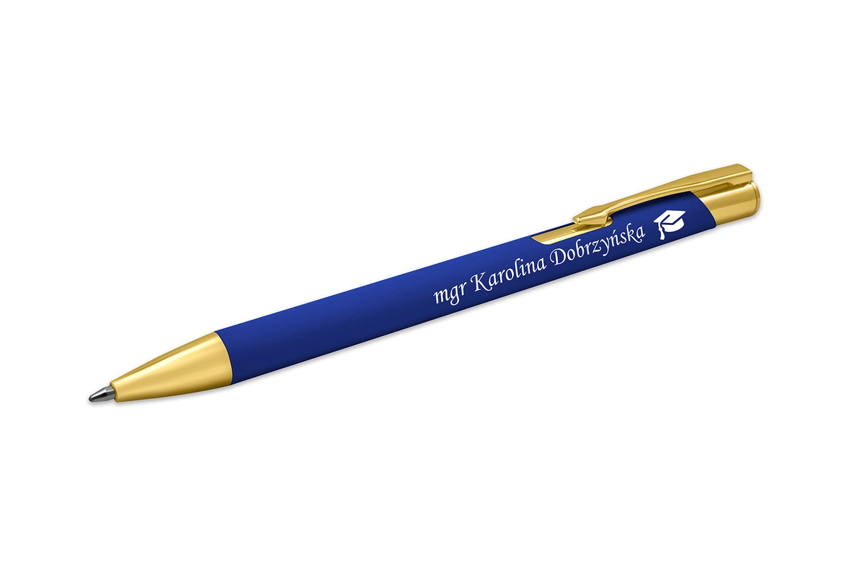 - Elegancki długopis w kolorze granatowym z metalowym korpusem i złotymi akcentami. Doskonały wybór na prezent.