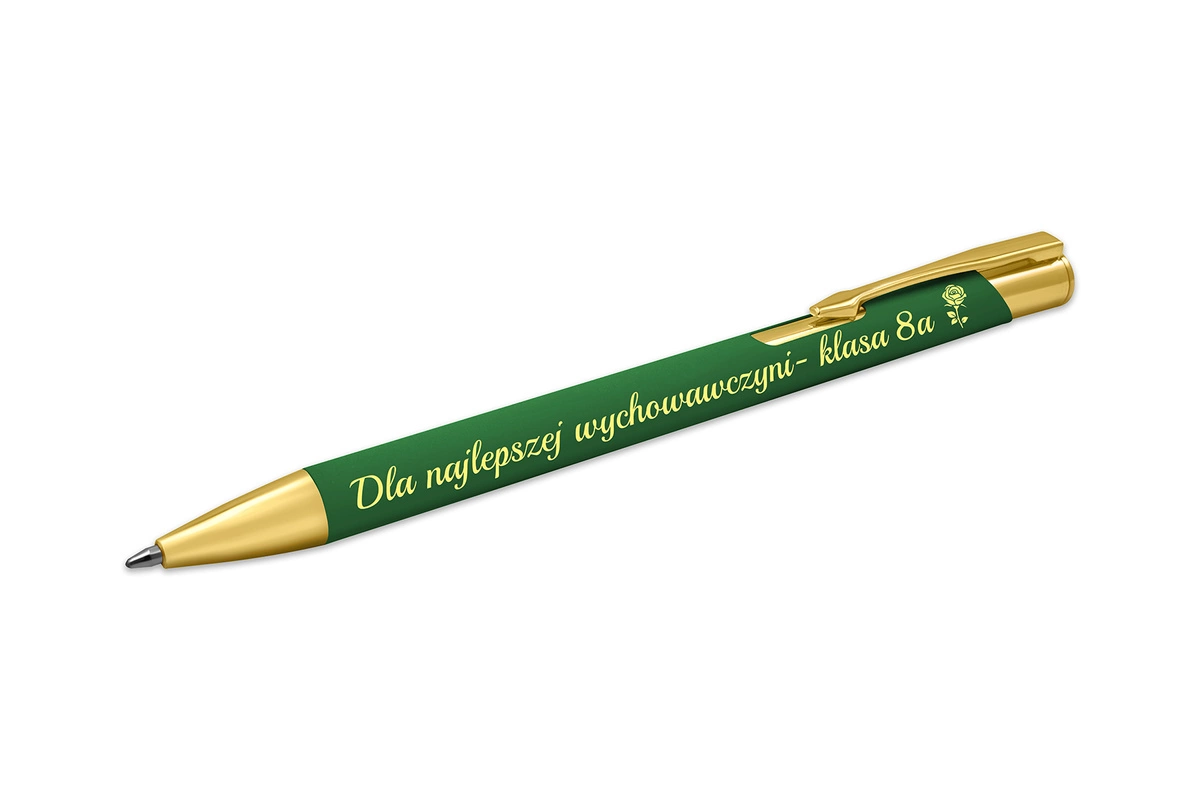 Elegancki metalowy długopis w kolorze zielonym, który wyróżnia się wysoką jakością wykonania połączoną z niezwykłym designem. Przyjemny powlekany korpus połączony z delikatnym mechanizmem wysuwania z pewnością świetnie się sprawdzi przy dłuższym pisaniu. Złote elementy dodają mu uroku sprawiając, że będzie to doskonały prezent na niemal każdą okazję.