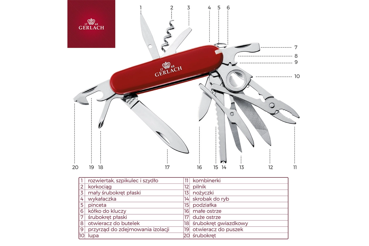 Gerlach Scyzoryk Wielofunkcyjny MOCNY 20 funkcji GRAWER Prezent dla Taty
