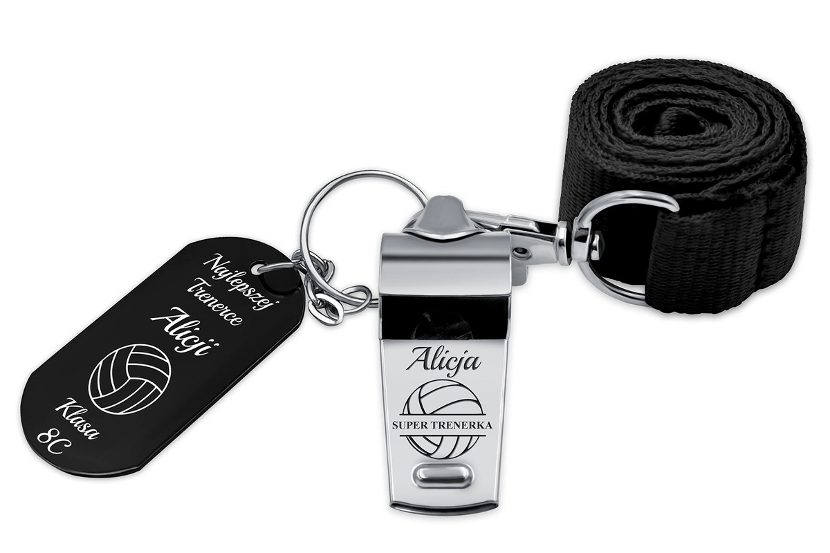 - Gwizdek z grawerem i brelok w komplecie – świetny zestaw prezentowy dla nauczyciela lub trenera. Trwała konstrukcja, głośny dźwięk, smycz GRATIS. Całość zapakowana w eleganckie pudełko.