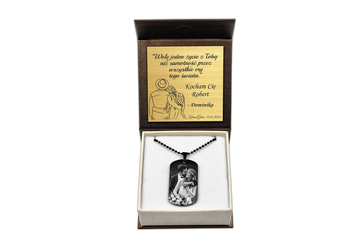 Wyjątkowy nieśmiertelnik składający się z połączenia wysokiej jakości stali szlachetnej z solidnym łańcuszkiem kulkowym. Unikatowy grawerunek zdjęcia jak i tekstu odporny jest na zarysowania, przetarcia oraz rdzewienie stając się ponadczasową pamiątką. Możliwość umieszczenia dedykacji na tabliczce sprawi, że Twój prezent stanie się jeszcze bardziej osobisty i pełen emocji, pozostawiając niezapomniane wrażenie na obradowanej osobie.