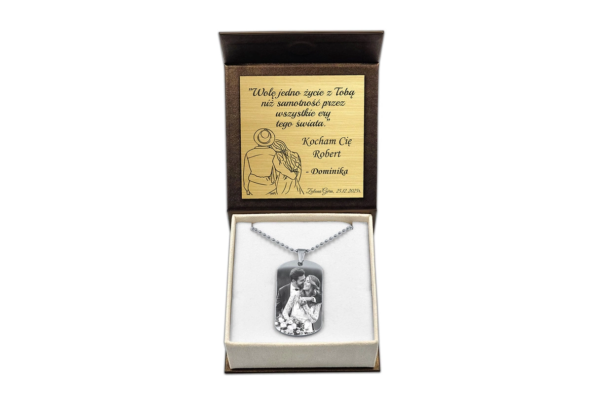 - Elegancki nieśmiertelnik z grawerem zdjęcia i tekstu. Wykonany z wytrzymałej stali nierdzewnej, odporny na zarysowania i rdzewienie. Idealny prezent dla ukochanej osoby. Grawer gratis! Eleganckie pudełko w zestawie.