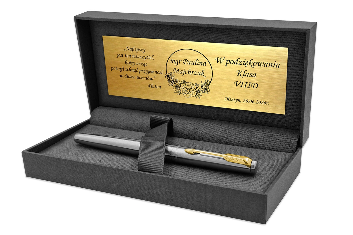 - Pióro wieczne Parker Jotter GT w zestawie z eleganckim etui to luksusowy prezent. Wysokiej jakości stal i złoty klips łączą się z możliwością personalizacji. Idealne dla osób ceniących elegancję i indywidualny charakter upominku.