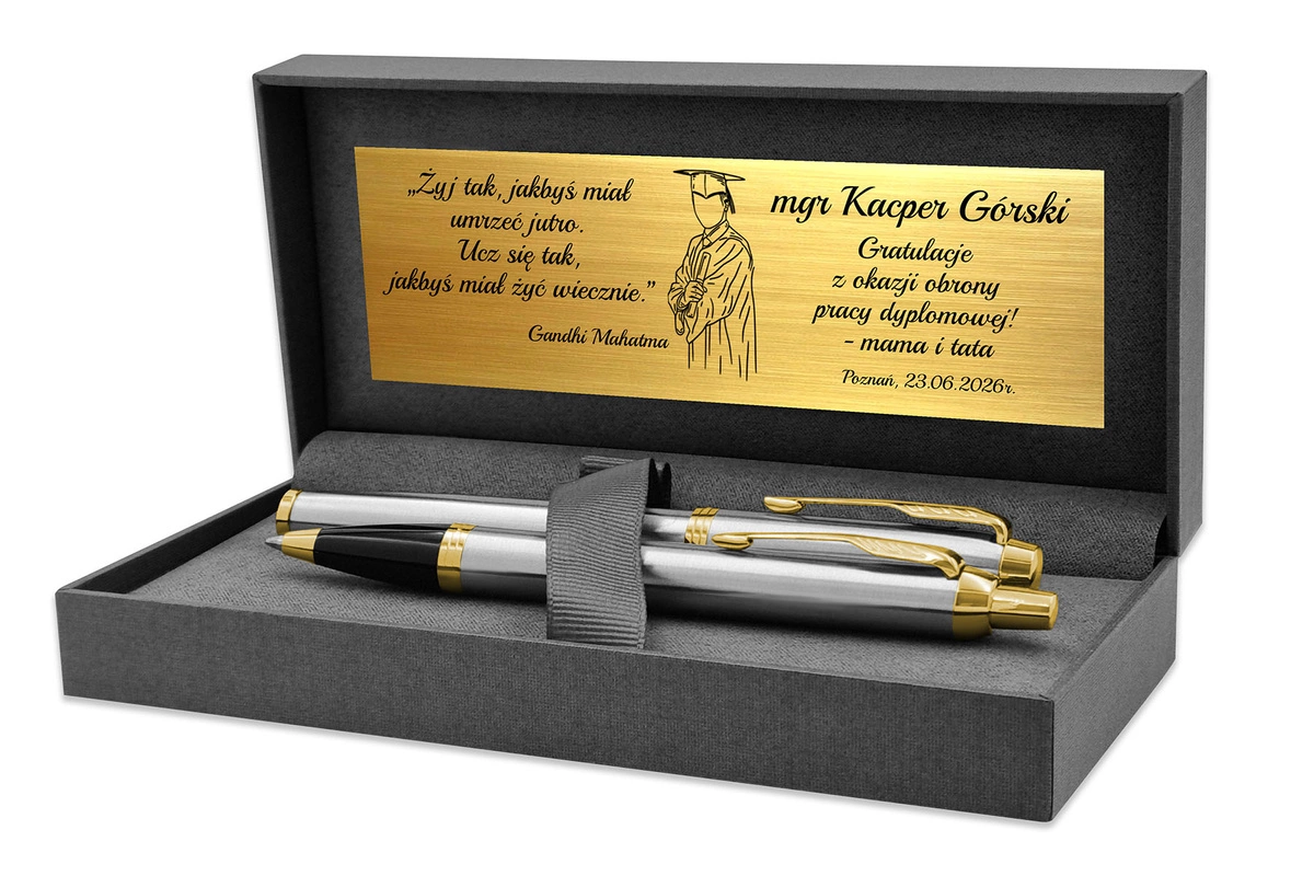 Pióro Wieczne oraz Długopis renomowanej firmy Parker charakteryzujące się ponadczasowym eleganckim designem połączonym z najwyższą funkcjonalnością. Niezawodne konstrukcje składające się z mosiężnych szczotkowanych korpusów połączone zostały z platerowanymi 23 karatowym złotem klipsami i pierścieniami. Jest to doskonały zestaw dla osób ceniących niezawodność, elegancję oraz wygodę.