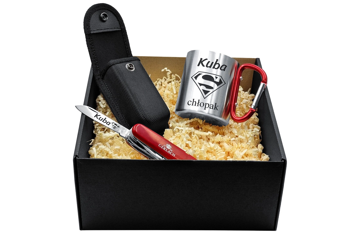 Elegancki zestaw prezentowy w czarnym boxie z czerwoną kokardą to idealny upominek dla miłośników outdooru, turystyki, podróży oraz praktycznych akcesoriów. W jego skład wchodzi wszechstronny scyzoryk Gerlach Assist 20 oraz kubek turystyczny ze stali nierdzewnej z karabińczykiem. Oba produkty można spersonalizować trwałym grawerem, czyniąc zestaw wyjątkową i osobistą pamiątką.