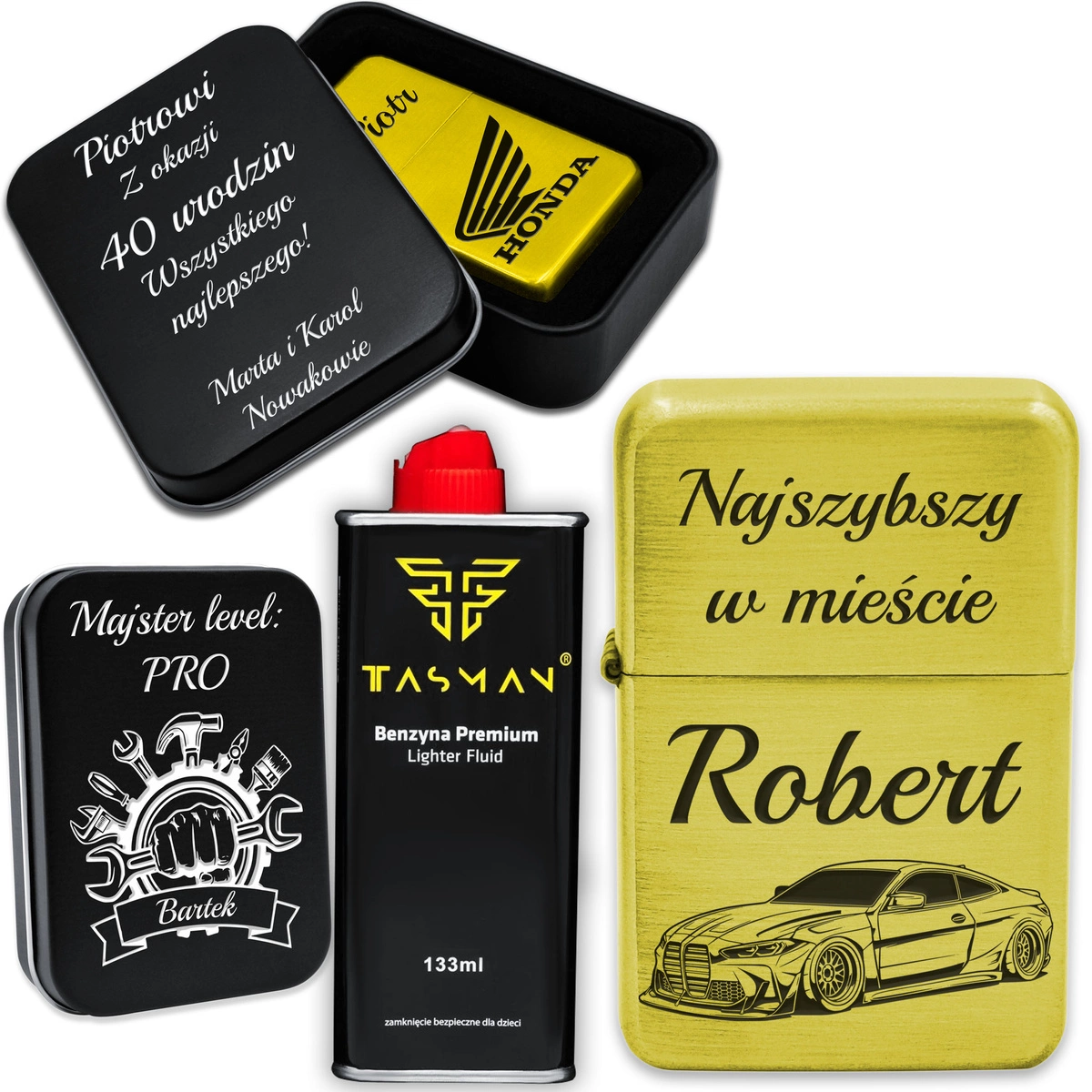 - Niezawodna zapalniczka w kolorze złotym z indywidualnym grawerem. Elegancki design, niezawodność i wieczysta gwarancja producenta. Doskonały prezent dla ukochanego mężczyzny. Benzyna Zippo GRATIS!