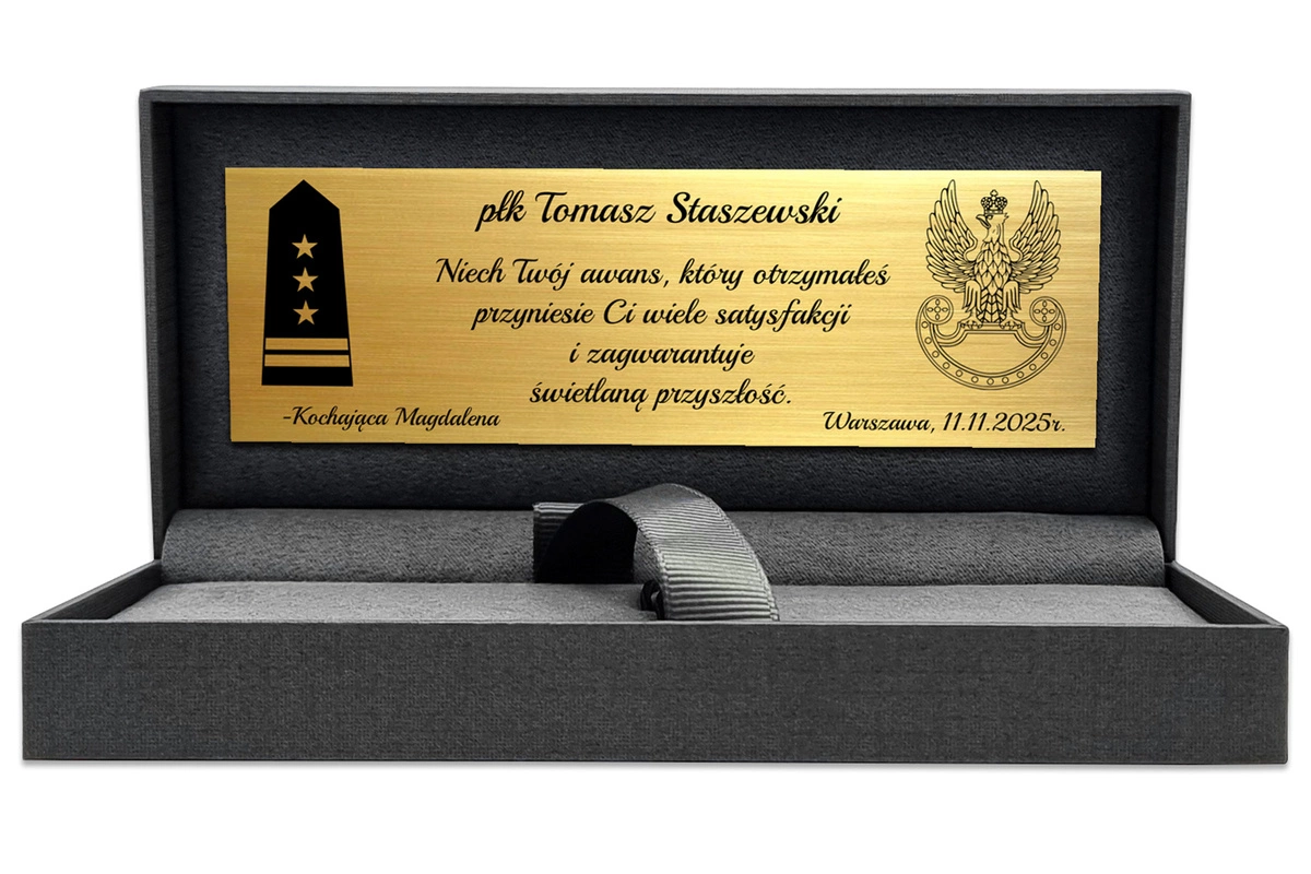 - Możliwość wyboru tabliczki w kolorze złotym lub srebrnym