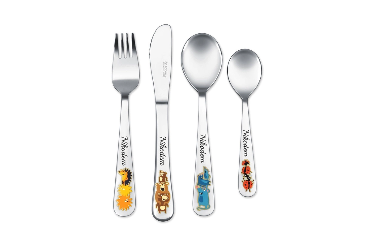 - Sztućce Tescoma Bambini z motywem "Zwierzątka", wykonane ze stali nierdzewnej. Zaokrąglone końcówki dla bezpieczeństwa dzieci. W zestawie łyżka, widelec, nóż, łyżeczka, opakowanie prezentowe.
