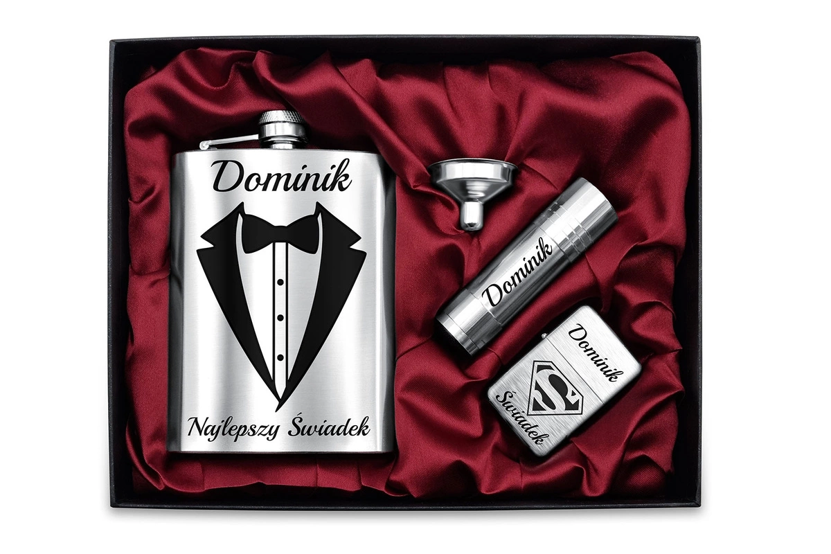 Stylowy zestaw dla każdego mężczyzny. Wysokiej jakości piersiówka z latarką, zapalniczką oraz lejkiem wykonano ze stali szlachetnej, która nie rdzewieje i jest bezpieczna dla zdrowia. Zestaw doskonale łączy wyjątkowy design z wysoką funkcjonalnością. Świetnie nada się na Wieczór Kawalerski, Biwaki czy wspólny połów ryb. Unikatowy grawerunek odporny jest na zarysowania, przetarcia oraz rdzewienie tworząc ponadczasową pamiątkę.