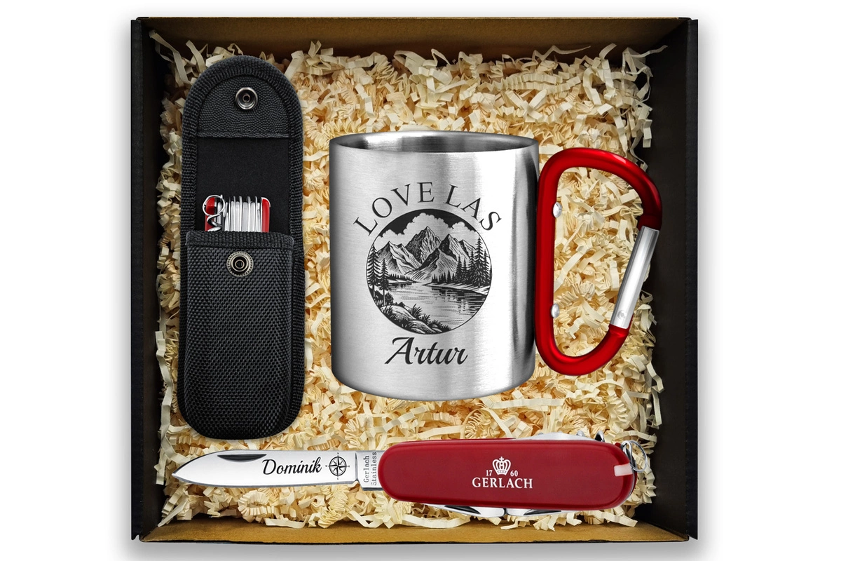 Elegancki zestaw prezentowy w czarnym boxie z czerwoną kokardą to idealny upominek dla osób ceniących praktyczne, wytrzymałe i stylowe akcesoria outdoorowe. W zestawie znajdują się dwa funkcjonalne produkty: scyzoryk Gerlach Assist 12 oraz kubek turystyczny ze stali nierdzewnej z karabińczykiem. Oba elementy można spersonalizować trwałym, nieścieralnym grawerem, dzięki czemu zestaw stanowi wyjątkową i osobistą pamiątkę.